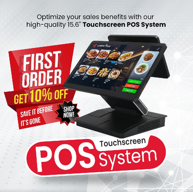 Ecran Caisse Tactile de 15,6″ con segunda pantalla opcional, compatibilidad con NFC/MSR/llave Dallas, diseño de pantalla plegable y SSD intercambiable.